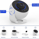 La veilleuse Galaxy prend en charge la projection de disques vidéo clairs, ainsi que la lumière blanche douce de 6500K. Vous pouvez ajuster la mise au point en tournant l'objectif pour obtenir une scène de ciel étoilé plus claire et colorée. Les lumières d'étoiles vous mettent dans un bel environnement spatial.